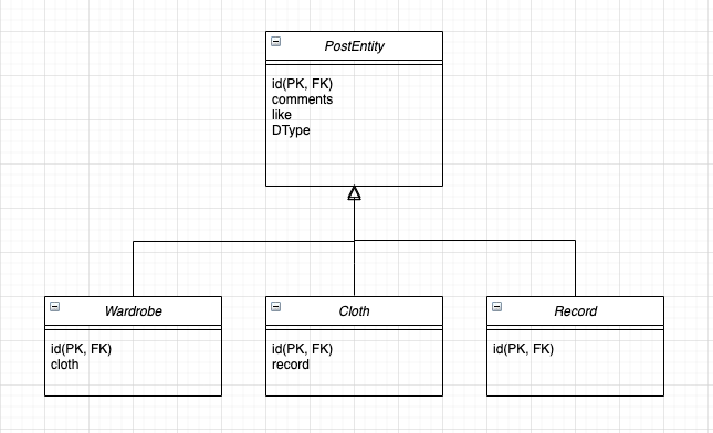 PostEntity์ ์๋ธ ํ์ ์ธ ๋ชจ๋ ์ํฐํฐ๋ค์ ํ๋์ ํ ์ด๋ธ๋ก ๊ด๋ฆฌํ๋ ์์ ์ ๋ต์ด๋ค. ์กฐ์ธ์ด ๋ฐ์ํ์ง ์์ผ๋ฉฐ ๋ฐ์ดํฐ๋ฅผ ๋ณ๊ฒฝํ ๋ ํ๋ฒ์ ์ฟผ๋ฆฌ๋ง ๋ ๋ฆฌ๊ฒ ๋๋ค. ํ๋์ ํ ์ด๋ธ์ ๋ชจ๋ ์์ฑ์ ๊ด๋ฆฌํ๊ธฐ ๋๋ฌธ์ ๊ตฌ๋ถ์ ์ํด DType์ด ํ์๋ก ํ์ํ๋ค. ๋ง์ฝ์ @DiscriminatorColumn์ ์ง์ ํ์ง ์์๋ ๊ธฐ๋ณธ์ ์ผ๋ก DType ์ปฌ๋ผ์ด ์์ฑ๋๋ค.