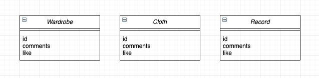 ๋๋ง์ ์ท์ฅ ์๋น์ค์ Entity์ธ Wardrobe(์ท์ฅ), Cloth(์ท), Record(์ฝ๋)๋ ๋๊ธ์ด ๋ฌ๋ฆด ์ ์๊ณ , ์ข์์๊ฐ ๋๋ฆด ์ ์๋ ๋์ผํ ํน์ง์ ๊ฐ์ง๊ณ ์๋ค. ๊ทธ๋์ Entity์ธ Like(์ข์์)์ Comment(๋๊ธ)์ Wardrobe, Cloth, Record๊ฐ ์์ฑ์ผ๋ก ๋ชจ๋ ํฌํจํ๊ณ Wardrobe, Cloth, Record ๊ฐ๊ฐ์ ๋ชจ๋ Like์ Comment๋ฅผ ํฌํจํ๋ ์์ผ๋ก ๊ตฌํ์ ํ์๋ค.