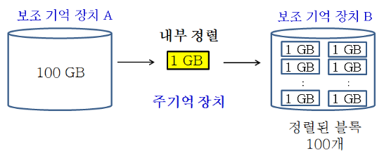์ธ๋ถ ์ ๋ ฌ์ ์ฃผ๊ธฐ์ต์ฅ์น์์ ์์ฉํ ์ ์๋ ๋ฐ์ดํฐ์ ๋ํด์๋ง ์ฝ์ด, ๋ด๋ถ์ ๋ ฌ์ ์ํ ๊ทธ ๊ฒฐ๊ณผ๋ฅผ ๋ณด์กฐ ๊ธฐ์ต ์ฅ์น์ ๋ค์ ์ ์ฅํ๋ค. ์ฌ๊ธฐ์ ๋ด๋ถ ์ ๋ ฌ์ ์ํฉ์ ๋ง๋ ์ ๋ ฌ์ ์ฌ์ฉํ๋ฉด ๋๋ค.
