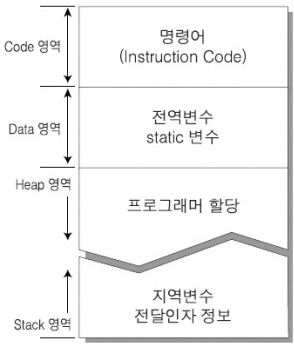 λ€μκ³Ό κ°μ΄ Code μμ, Data μμ, Heap μμ, Stack μμμΌλ‘ ꡬλΆλμ΄ μλ€. μ»΄νμΌ μμ μ§μλ³μλ₯Ό μΌλ§λ μ¬μ©ν μ§ λ―Έλ¦¬ κ³μ°ν μ μκΈ° λλ¬Έμ λ°νμμ μ§μλ³μ μ μΈ μμμ λ°λΌ μ€ν μμμ μμͺ½μΌλ‘ μ£Όμ κ°μ λ§€κΈ°κ³ λμ ν λΉλ λ ν μμμ μλμͺ½μΌλ‘ μ£Όμκ°μ λ§€κΈ΄λ€.