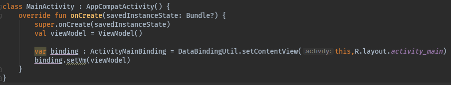 ActivityMainBindingκ³Ό κ°μ΄ μμ μ΄ μ μΈν μ‘ν°λΉν°μ μ΄λ¦μ λ°λΌ ν΄λμ€κ° μλμΌλ‘ μμ±λ©λλ€. ν΄λΉ ν΄λμ€λ₯Ό μ΄μ©νλ©΄ μ‘ν°λΉν°μ xml νμΌ κ°μ λ°μΈλ©μ΄ κ°λ₯ν©λλ€.