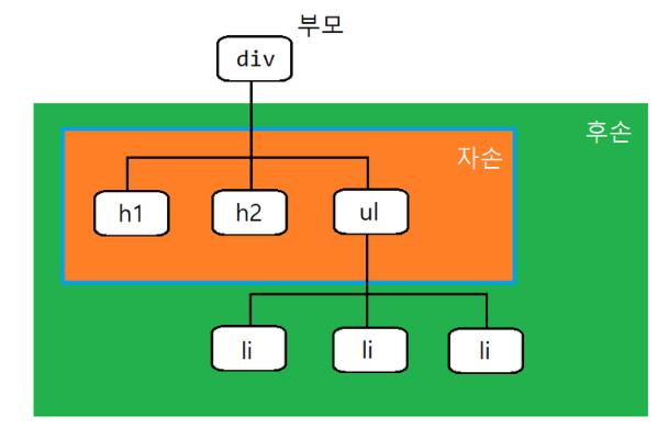 ๊ทธ๋ฆผ์์ div์ ์์์ด๋ h1,h2,ul์ ์๋ฏธํ๋ฉฐ, div์ ํ์์ ์์์ ํฌํจํ์ฌ li,li,li๋ฅผ ๋ปํ๋ค.