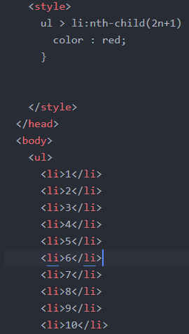 ul์ ์์์ด๋ฉด์ li์ ๊ฐ์ ๋ ๋ฒจ์ ์์๋ค์ ์งํฉ์ค์์ 2n+1์ ์์ด์ ํด๋น๋๋ ์์๋ฅผ ๊ฐ์ง ํ๊ทธ์ ์์ red๋ก ๋ฐ๊พธ์ด๋ผ ๋ผ๋ ์๋ฏธ์ด๋ค.